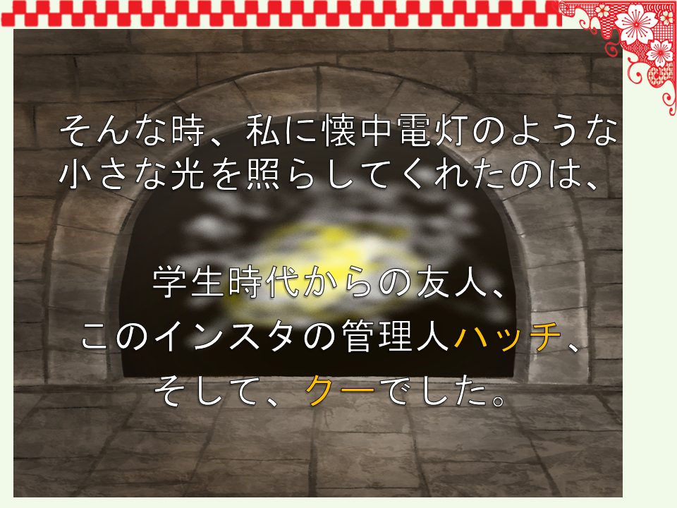 私の場合、こうやって支えられたのも管理人のハッチ、そして、クーの存在が大きかったです。