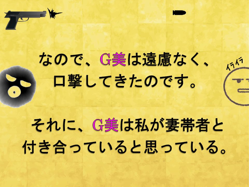 この時、G美は私が既婚者と付き合っていると思い込んでいます。
