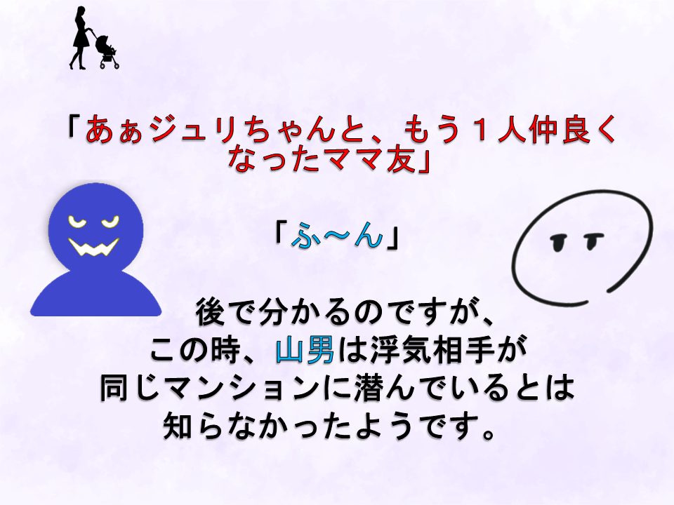 この時まで明かしませんでしたが、夫も浮気相手が傍に潜んでいたなんて知らなかったようです。